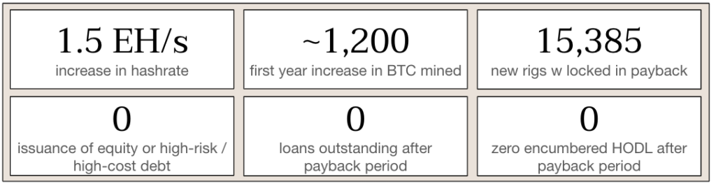 The results are compelling. After the payback period, the miner will have an additional ~15,400 rigs producing 1.5 EH/s in additional hashrate. Thus, $50m in idle HODL has, in a risk-minimized and low-cost fashion, birthed 15,400 rigs with 1.5 EH/s in hashrate.