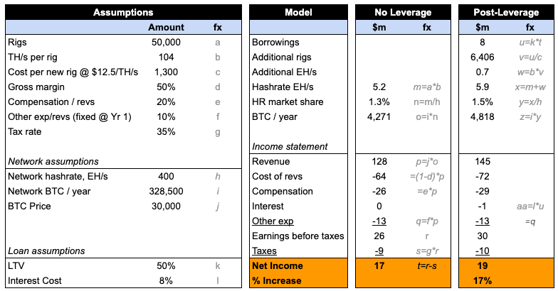 We believe banks or non-bank lenders may eventually lend against hedged future production, as they do with E&P energy producers. While not available now, we show the below model to demonstrate just how powerful such a construct is. Here, a miner with ~5 EH/s in hashrate and no leverage generates $17m in net income. But, if the miner is able to borrow against half of its future earnings, the miner may immediately increase its hashrate by 13% and net income by 17%.
