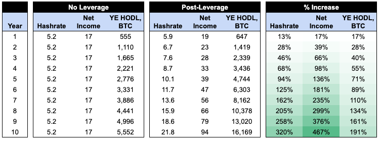 In addition, the benefits of such a strategy compound over time. This is because a miner who borrows against hedged future production can grow faster now, which increases its earnings in a year, enabling it to borrow more a year from now, continually increasing the amount of hashrate it may add each year. In fact, a miner employing this strategy for ten years will increase its hashrate 4.2x, net income 5.7x, and HODL 2.9x compared to baseline.