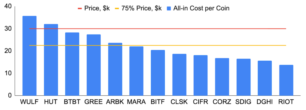 Source: TheMinerMag, GSR. Note: Estimates by TheMinerMag.com and are for 1Q23. All-in mining costs include the cost of bitcoin production as well as corporate overhead and financial expenses.