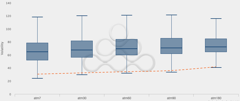 Source: Amberdata, GSR. Note: The chart depicts the boxplots of ATM volatility in constant maturity. Besides the information about the percentile distribution (0.25, 0.50, 0.75), the lower and upper fences are calculated using the standard metrics of Q1 – 1.5 * IQR and Q3 + 1.5 * IQR (where IQR = Q3-Q1). This tool helps to identify cheap/rich implied volatility compared to its historical values. The dotted line represents the current value, as of August 8, 2023.