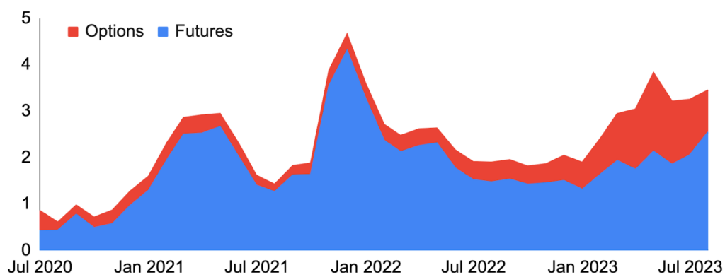 Source: The Block, GSR. Note: Options OI is not delta adjusted and thus OI across options and futures does not denote equivalent economic exposure.