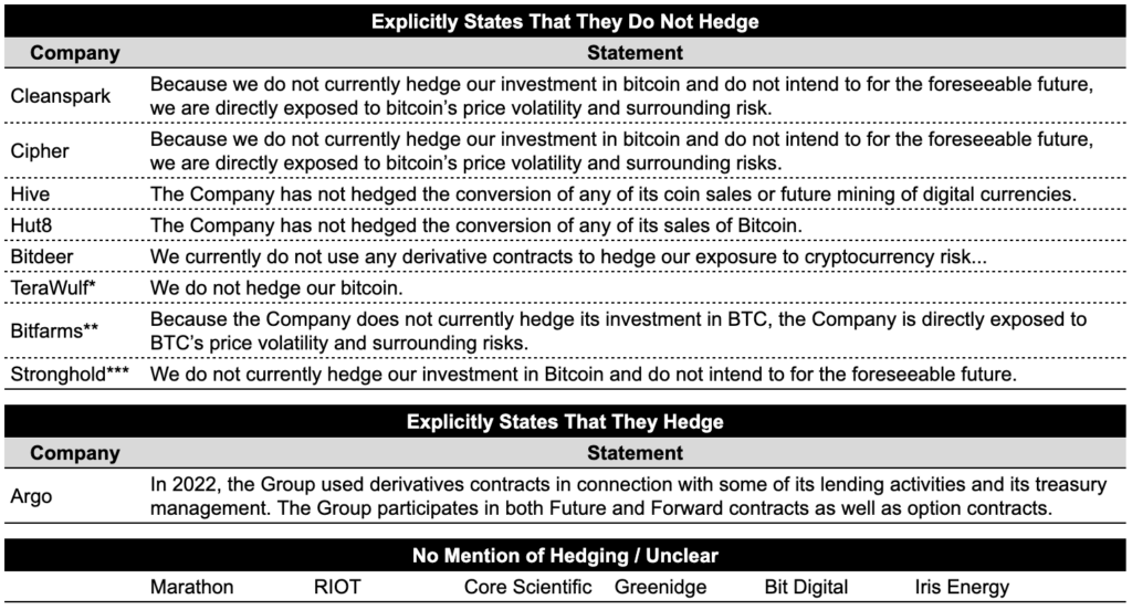 Source: Company websites, SEC, Sedar+, GSR. Note: Searches for the terms hedg*, option*, derivative*, and risk management, and only includes discussions around hedging the price of bitcoin or network hashrate/difficulty. Uses annual regulatory filings per each company’s jurisdiction (eg. US filers search 10-Ks; Canadian filers search annual AIF, financial statement and MD&A, etc). *TeraWulf 10-K also states “Incremental revenues may be generated through the hedging and sale of mined bitcoin” **Bitfarms also states “In the future, the Company may enter into certain hedging transactions to mitigate its exposure to aspects of the economy or specific economic conditions that are particularly volatile, including the market price of BTC and interest rates.” ***Stronghold had previously entered into a variable prepaid forward sales contract derivative, and the 10K states “The Company also uses derivative instruments to mitigate the risks of Bitcoin market pricing volatility” though it appears they are not currently hedging given the above statement.