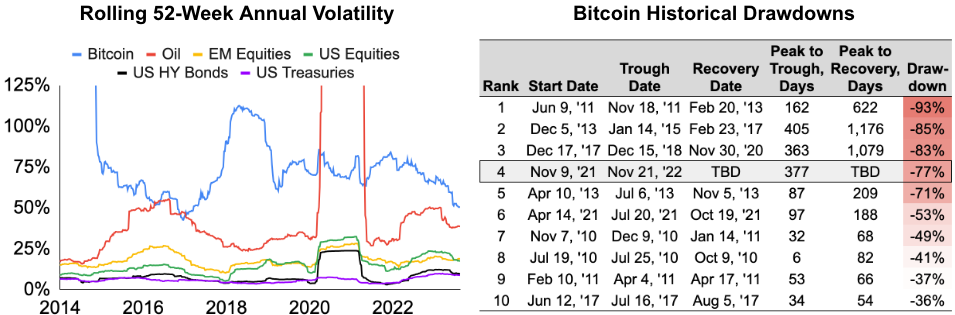 Bitcoin is a particularly volatile asset with routine, large drawdowns that can threaten mining economics and even put a miner’s continuing viability in question. Indeed, bitcoin’s volatility is multiples that of other assets, for example, averaging 8x that of high yield bonds and 4x that of domestic equities. Moreover, bitcoin routinely experiences extremely large drawdowns, demonstrated by its recent 77% decline between November 2021 and November 2022 and its 83% decline between December 2017 and December 2018. Such high volatility and frequent drawdowns directly impact miner earnings and has put many miners in peril.