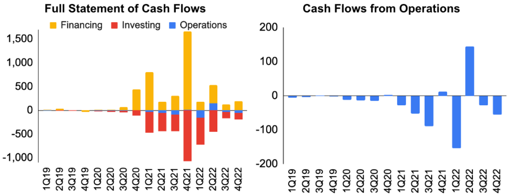 Note that hedging to ensure required cash outlays can be met is of particular importance for bitcoin miners given industry cash flow dynamics. Unlike other industries that can consistently self-fund via operations, miners often produce negative operating cash flow and have turned to financings or asset sales to generate cash. However, as we’ve seen in the latest downturn, debt and equity financing (included below in the cash flow from financing activity category) is not always available and a miner only has so many assets that it can sell (which typically occurs when asset prices are low; also, cash flow from investing activity is typically negative as miners use cash to buy rigs and facilities). As such, hedging is particularly important to ensure that cash flow from operations is at least breakeven and the miner generates enough cash to sustain itself even when the financing markets and asset sales are unavailable.