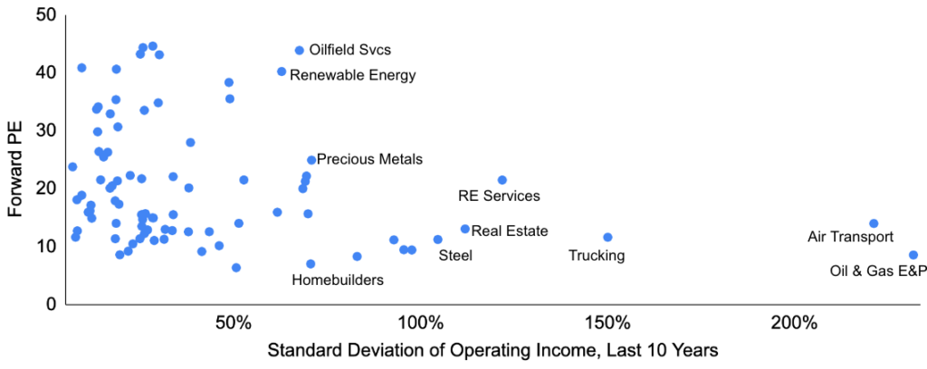 Earnings Volatility vs. Earnings Multiple by Subsector