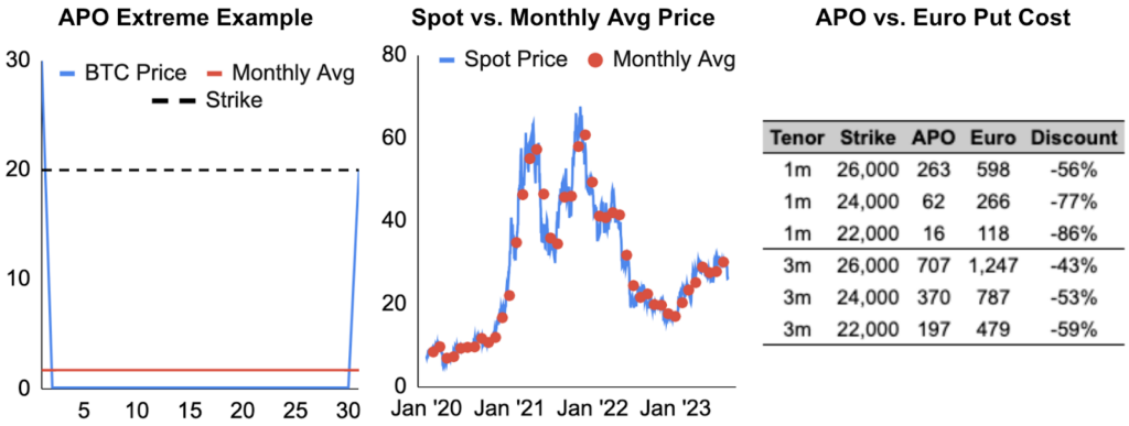 There are various types of options available, most notably American options, European options, and Average Price Options (APOs). Both American and European options compare the spot price of the underlying to the strike price when determining intrinsic value, though American options can be executed anytime on or before expiry while European options can only be executed upon expiry. Average Price Options, by contrast, compare the average price of the underlying over the life of the option to the strike price to determine its value at expiry. This has two main advantages for miners. First, since miners constantly produce bitcoin throughout the month, the average price better matches the price at which the miner produces bitcoin, making it a much better hedge for miners who sell BTC when produced. For example, with bitcoin at $30,000, a miner who is constantly producing and selling bitcoin throughout the month could buy put options to hedge its production with a strike price of $20,000. In an extreme example, bitcoin could fall to $1,000 for the entire month before recovering to $20,000 on the expiry date. If the option was a European option, it would expire worthless, as the spot price at expiry matched the strike price, making the European option ineffective as a production hedge. However, if it was an average price option, the average price for the month would effectively be $1,000, and the miner would make $19,000 per bitcoin hedged less the cost of the option ($20,000 strike price – $1,000 average price), offsetting the decline in mining revenue below the $20,000 price point and proving to be a much more effective hedge. The second reason why APOs are a good choice for miners is that the average price is much less volatile than the spot price, and as volatility is a main determinant of options pricing, APOs are much cheaper than European or American style options. Below we show a comparison of recent example pricing for APO puts vs. European puts with different strike prices and tenors. The APO is significantly cheaper in every case, offering a 40-85% discount to a comparable European option. Finally, note that most options in crypto are far and away European style, and very few trading firms offer APOs. GSR co-underwrote the first APO in the space and has consistently underwritten them since.