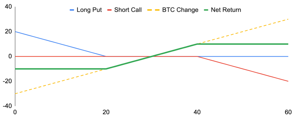 While swaps require both parties to exchange cash flows and thus fully lock in future prices, some market participants prefer options, as it confers the right, but not the obligation to transact for the option buyer. Buying an outright option on bitcoin, however, can be expensive given the high volatility of bitcoin. As such, a miner may use a strategy known as a costless collar, where it sells an out-of-the-money call option and uses the premium generated from the sale to finance the purchase of a protective put. In doing so, the miner protects against large losses in exchange for giving up some upside. For example and as shown below, with the price of bitcoin at $30,000, the miner may sell a call option that expires in one month (or any expiration they choose) with a strike price at $40,000, obligating the miner to sell bitcoin to the buyer for $40,000 should bitcoin move above $40,000 at expiry. The miner will then use the premium it received for the call option to finance the purchase of a put option, say, with a strike price of $20,000. Thus, if the price of bitcoin falls below $20,000 at expiration, the miner will be able to sell bitcoin at $20,000 at expiry. Note that put and call strikes can be customized based on risk appetite, desired upside capture, and desired cost, and can even be set up to have a negative cost (ie. the miner can get paid to hedge by selling more expensive upside participation to finance cheaper downside protection). Moreover, there are various strategies that uniquely fit well with miners, such as selling an out-of-the-money European call option, which generates a higher premium given the greater volatility of spot bitcoin, and buying an APO put option, which will be cheaper and better hedge mining revenues. Such a strategy enables the miner to increase the call strike price for greater upside participation, increase the put strike price for greater downside protection, or some combination of both.