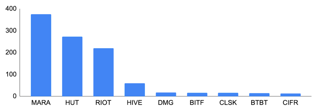 Source: TheMinerMag, GSR. Note: Amount of bitcoin on balance sheet represents the most recently reported number of bitcoin valued at $30,000 per BTC.