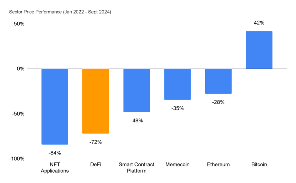 DeFi was central to the flurry of attention that was concentrated on crypto in 2020 and 2021. It sparked the imagination of many with the promise of an automated, efficient, flexible, and secure decentralized financial system. Despite this promise, the sector has languished since then. According to data from Artemis, since the beginning of January 2022 through the end of September 2024, tokens associated with DeFi protocols are down 72% as a sector, trailing sectors like memecoins (down 35%) and smart contract platforms (down 48%), and compared to Bitcoin’s 42% rise. The optimism of 2020 and 2021 has largely given way to pessimism in DeFi.
