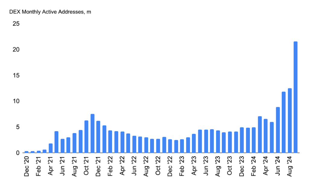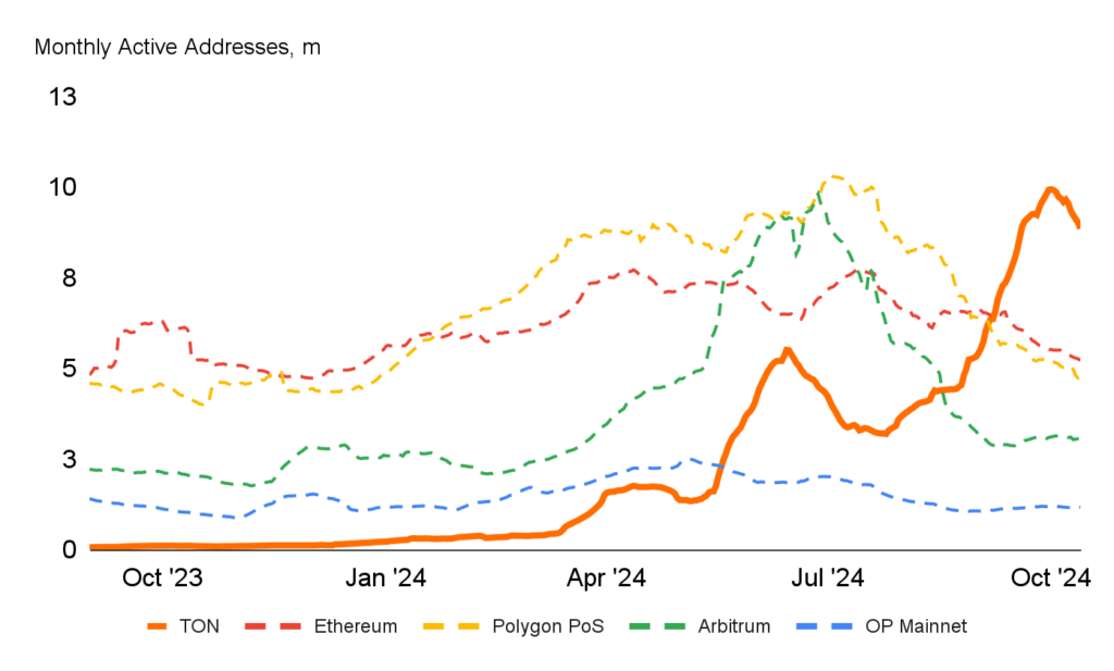 The user counts reached by tap-to-earn games on TON underscore the power of Telegram’s distribution. TON’s close integration with the messaging app puts crypto at the fingertips of 950 million Telegram users. Access to this user base has in a short time made TON one of the most used blockchains. Monthly active addresses on the network grew from around 100 thousand in September 2023 – when Telegram introduced its integrated wallet – to 9.9 million in September 2024. This puts TON ahead of Ethereum’s 5.5 million active addresses in September 2024, and ahead of popular Ethereum L2s and sidechains like Arbitrum, OP Mainnet and the Polygon PoS chain. By this metric, however, TON still lags behind chains like Base and Solana.